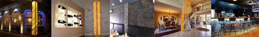 Accentuate your collection with backlit walls. Real stone veneer, thin slate veneer, faux onyx, and faux marble are all exquisite options for any wine cellar.