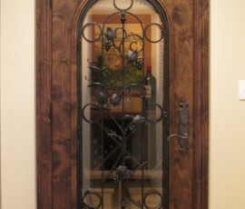 The Tuscan purpose built wine cellar door features an arched dual pane glass panel finished with a unique wrought iron design. The wood finish is an Early American stain and lacquer.