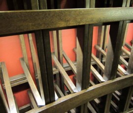 The cellar ends at the low end with another horizontal rack that tops off a lattice X bin with a lattice case storage rack at the bottom.