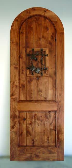 A solid wood door with a false speakeasy door. Grapevine design wrought iron. Arched top.