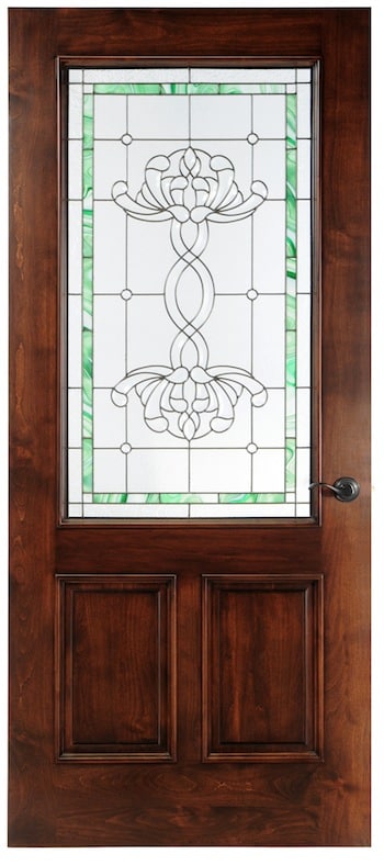 Stained glass upper window in clear and green design. The wood door has two wood panels below.