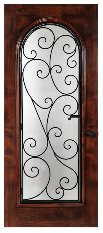 Operable wrought iron in a swirl pattern that makes for a beautiful showpiece. This wine cellar door features arched glass in a square door.