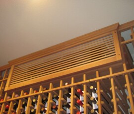 We placed the RM 3600 split wine cooling unit evaporator at the top most of the right wall. We concealed the equipment in a grill cover and box. To make it look like it was part of the racking, we used the wood, which was used for the wine racks. We placed the compressor outside the back wall.