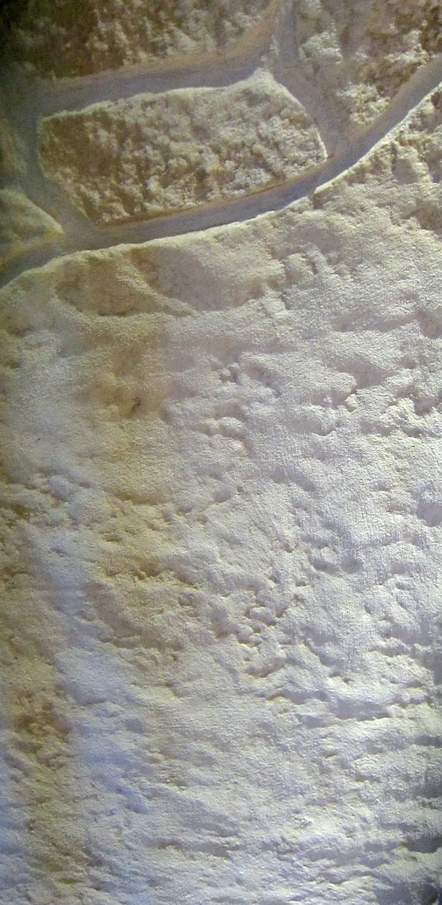 The walls and ceiling in the tasting or bar area, are made of Stonecoat material, which is a product made from crushed limestone from France, blown onto the surface. Once applied, it is hand-carved and colored.