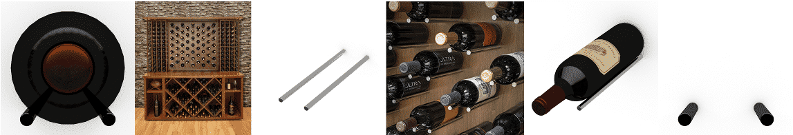 This storage system follows the basic board and peg concept. The stainless steel rods are attached to the backboard in rows. The pegs cradle the bottles with the necks facing out.