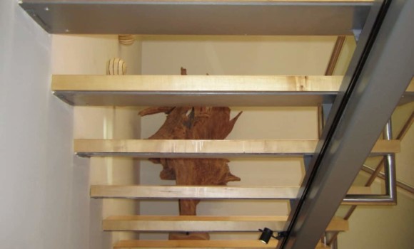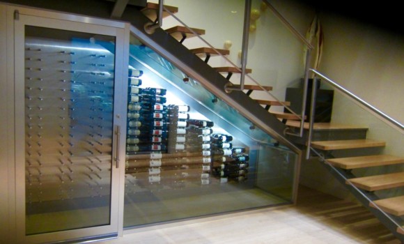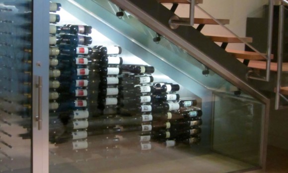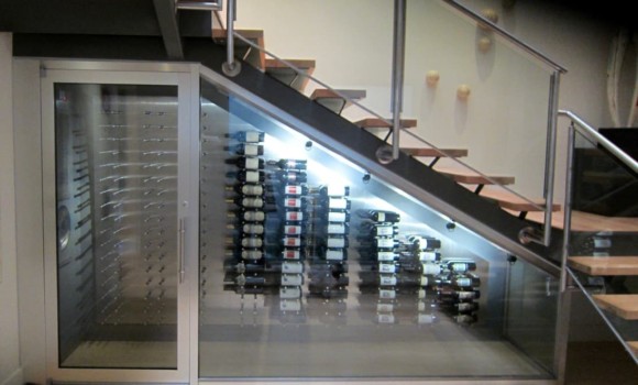 Wine Displayed in Custom Cellar Under Contemporary Staircase